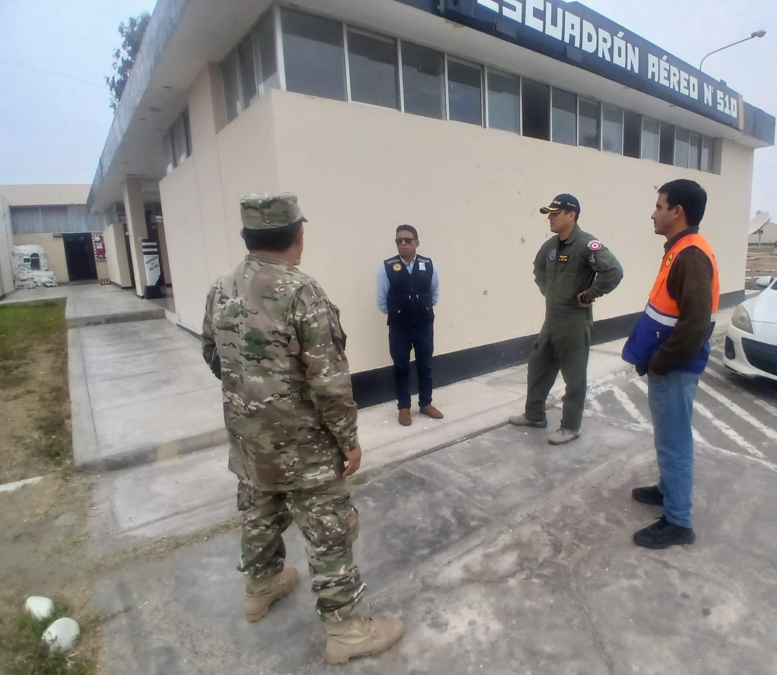 Por disposición del coronel PNP ® Ricardo Guillén Balbín, gerente regional de Seguridad, Defensa Nacional y Gestión del Riesgo de Desastres, los especialistas de la Sub Gerencia Regional de Gestión del Riesgo de Desastres sostuvieron una reunión con los representantes del Escuadron Aéreo N°513 y del Departamento de Operaciones y Entrenamiento de la Base Aérea de Pisco, para articular esfuerzos y coordinando el apoyo necesario como Gobierno Regional de Ica.